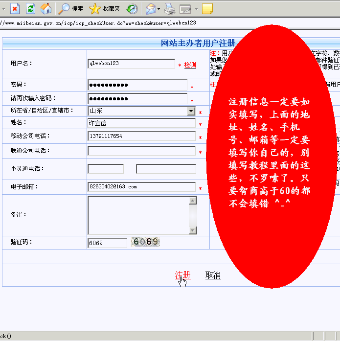 | 详细信息就是要详细到底,例如个人备案,主办单位通信地址填写格式:济南市槐荫区济西东路57号(小饮马附近)鑫城小区10号楼5单元701室 (个人备案用身份证号码) |